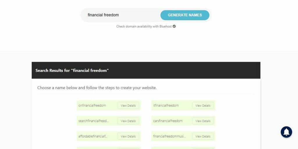 على سبيل المثال : إذا كنت تبحث عن أسماء مدونات جذابة في مجال المال والأعمال، فقد تكون الكلمة الرئيسية المُحتملة (الحرية المالية) وإذا قمت بالبحث عن ذلك على IsItWP name generator فستظهر النتائج لك كما في الصورة أدناه.