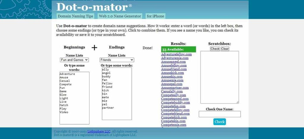 ولإضافة المزيد من التوابل إلى الوصفة، يحتوي Dot-o-mator أيضًا على مولد اسم ويب 2.0.