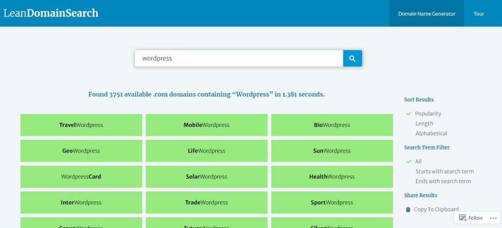 يعد Lean Domain Search حلًا سريعًا إذا كنت تبحث عن أسماء مدونات جذابة. محرك البحث الخاص بهم قوي للغاية بحيث يمكن اظهار آلاف النتائج في أقل من ثانية، ويصنف الموقع إجاباته حسب شعبيتها، على الرغم من أنه يحتوي أيضًا على خيارات الترتيب حسب الطول أو الترتيب الأبجدي.