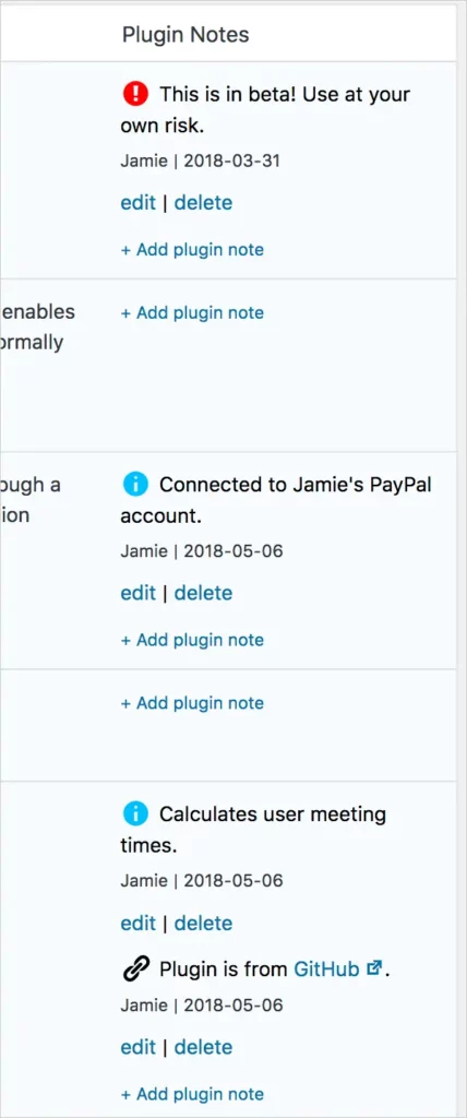 هذه الإضافة قد تكون مفيدة إن كنت تعمل على تطوير أو تعديل موقع لصالح شخص آخر، أو لصالح أحد العملاء. حيث إن إضافة Plugin Notes Plus تتيح لك إضافة ملاحظات في صفحة الإضافات نفسها، أي إضافة ملاحظة متعلقة بكل إضافة.