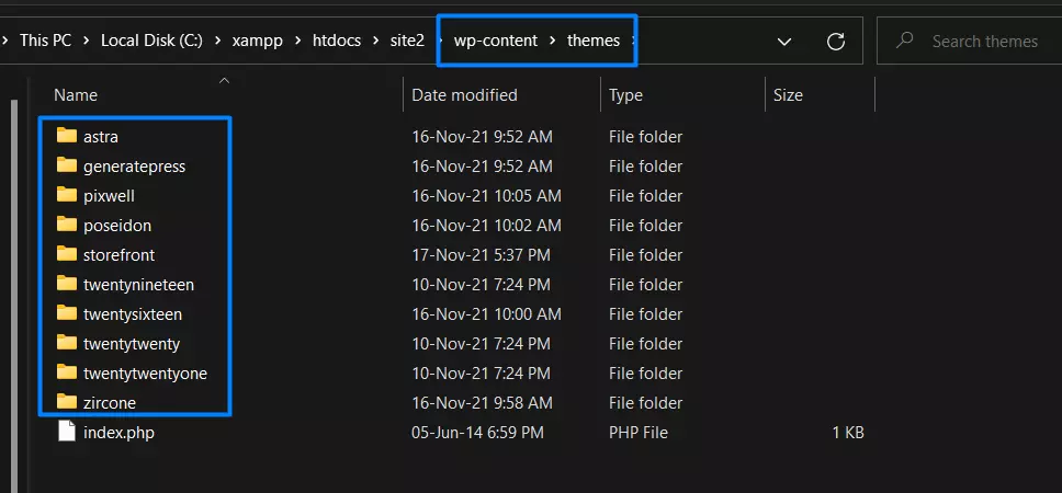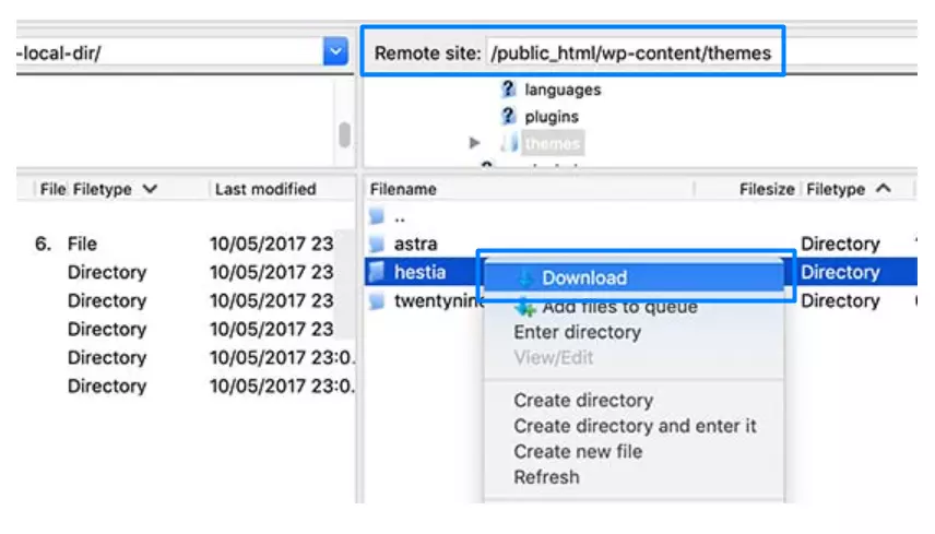 وبعد ذلك يجب عليك تحميل نسخة من مجلد القالب، وهو الموجود على المسار /wp-content/themes/ أي ضمن مجلد themes الرئيسي والواقع داخل مجلد wp-content. ويمكنك أن تصل إلى ملفات موقعك عمومًا إما عبر الاعتماد على تطبيق FTP كما سلف الذكر، أو من خلال لوحة تحكم الاستضافة الخاصة بك.