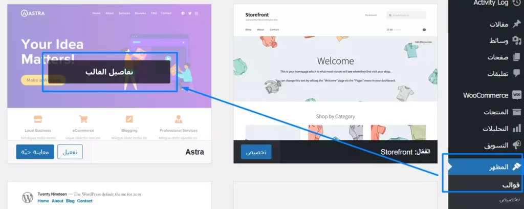 ولكي تطالع كافة القوالب التي تم تنصيبها على موقعك، وتحدد القالب الرئيسي من ضمنها فعليك أن تتبع الخطوات التالية: