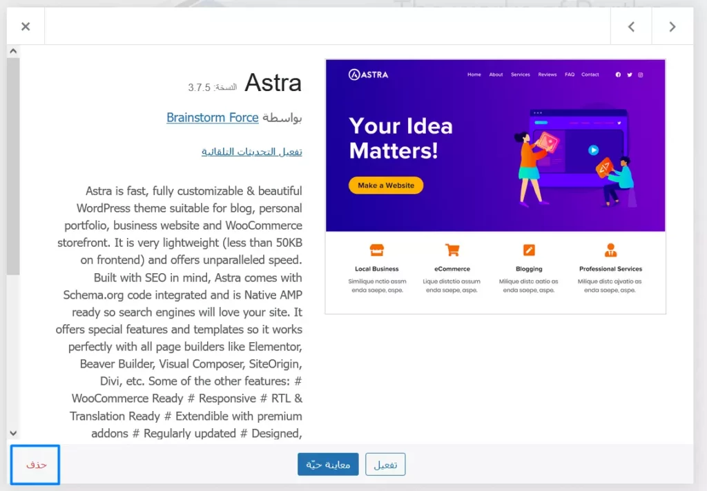والآن سيعرض عليك ووردبريس نافذة منبثقة تضم معلومات مفصلة عن القالب، إلى جانب خيارات مثل المعاينة، ولكن الأهم هو خيار الحذف، وبالضغط عليه يتم حذف القالب: