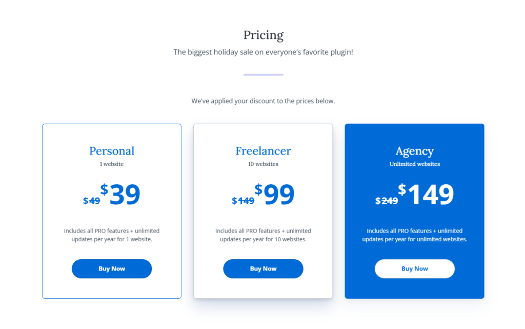 سعر النسخة المدفوعة من إضافة ACF يبدأ من 49 دولارًا سنويًا للاستخدام الشخصي، حيث تحصل على رخصة استخدام الإضافة لموقع واحد فقط. بينما تتيح لك الخطة الثانية Freelancer إمكانية الاستفادة من جميع مزايا النسخة الكاملة لـ 10 مواقع بسعر 149 دولارًا سنويًا. أما الخطة الأعلى Agency تكون بتكلفة 249 دولارًا سنويًا، ويوفر لك كافة المزايا المدفوعة لعدد غير محدود من المواقع.