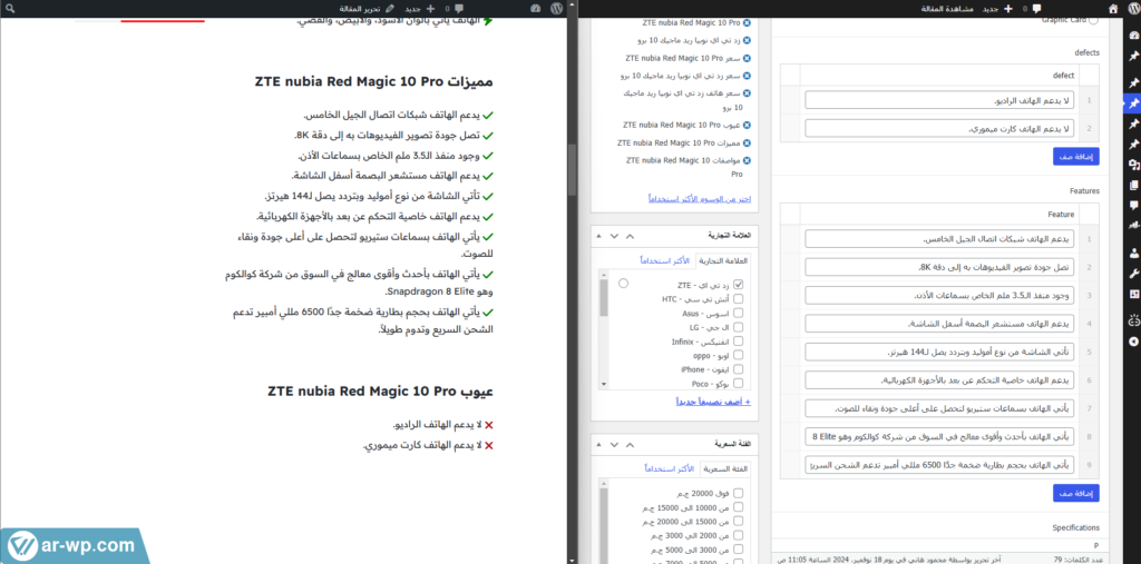 تُعرض هذه الحقول بطريقة بسيطة ومنظمة داخل صفحة المقالات، مما يتيح لكاتب المحتوى استخدامها مباشرةً لتوضيح مواصفات الهواتف بسهولة. بالإضافة إلى ذلك، قمت بتطويرها بإضافة حقول مخصصة تُبرز مميزات وعيوب الهاتف في صورة قائمة نقطية، ما يُسهم في تقديم المعلومات بشكل أكثر وضوحًا وتنظيمًا.