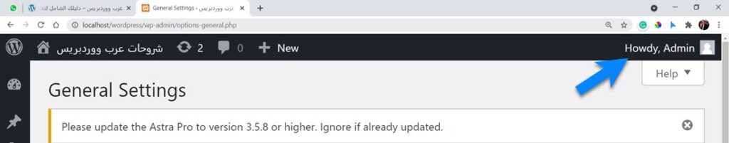 عندما يقوم المستخدم بتسجيل الدخول إلى لوحة التحكم الخاصة بموقع WordPress الخاص به، يتم الترحيب به بكلمة "Howdy" متبوعة باسم العرض الخاص به.