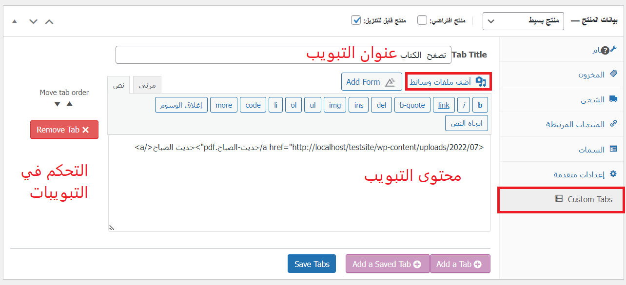 يمكنك من هنا إضافة عنوان التبويب وتحديد المحتوى الذي ستقوم بتضمينه في هذه التبويب ويمكنك إضافة أي نوع محتوى تريده (قمت هنا بإضافة ملف وسائط pdf )