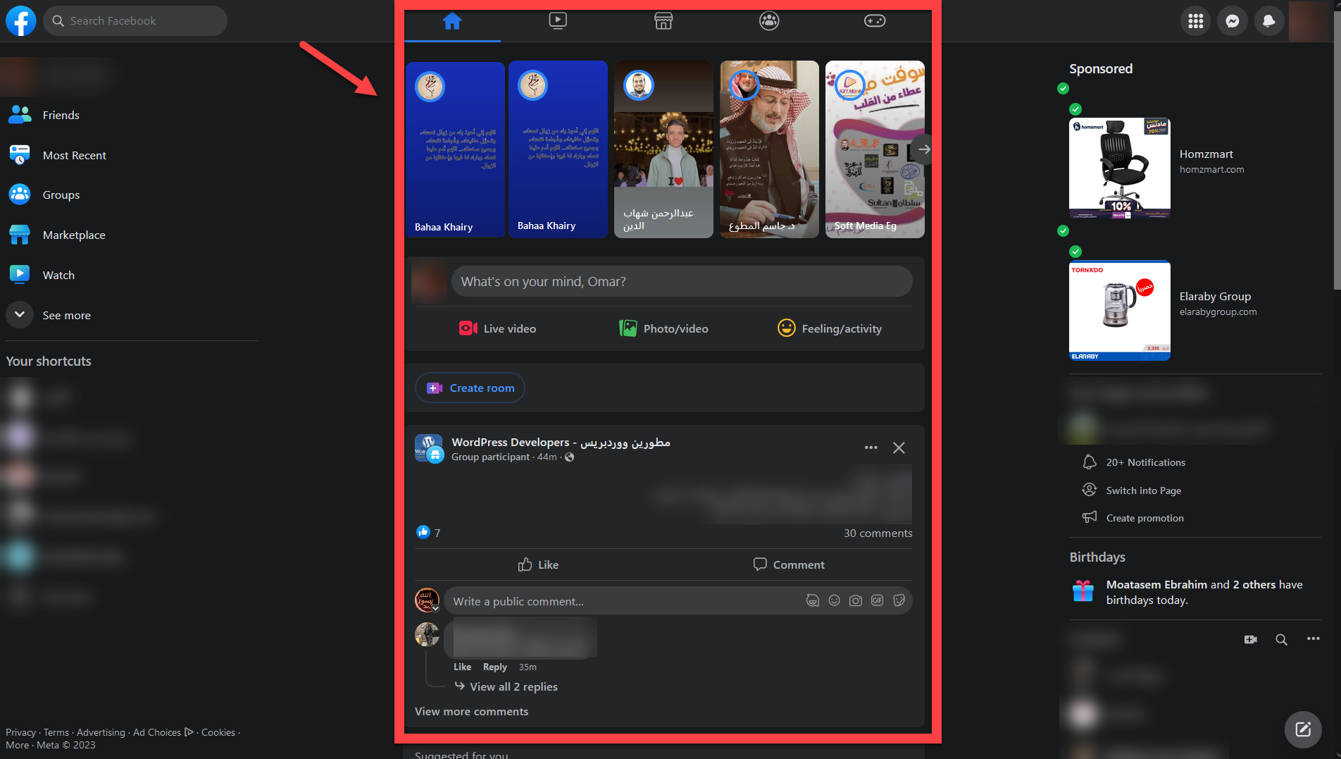 ستجد أن التصميم على سطح المكتب كأنه شاشة هاتف جوال يظهر بها آخر الأخبار والتبويبات الأساسية الخاصة بفيس بوك ثم عن اليمين وعن اليسار عناصر إضافية مثل الإعلانات والوصول السريع وغير ذلك.