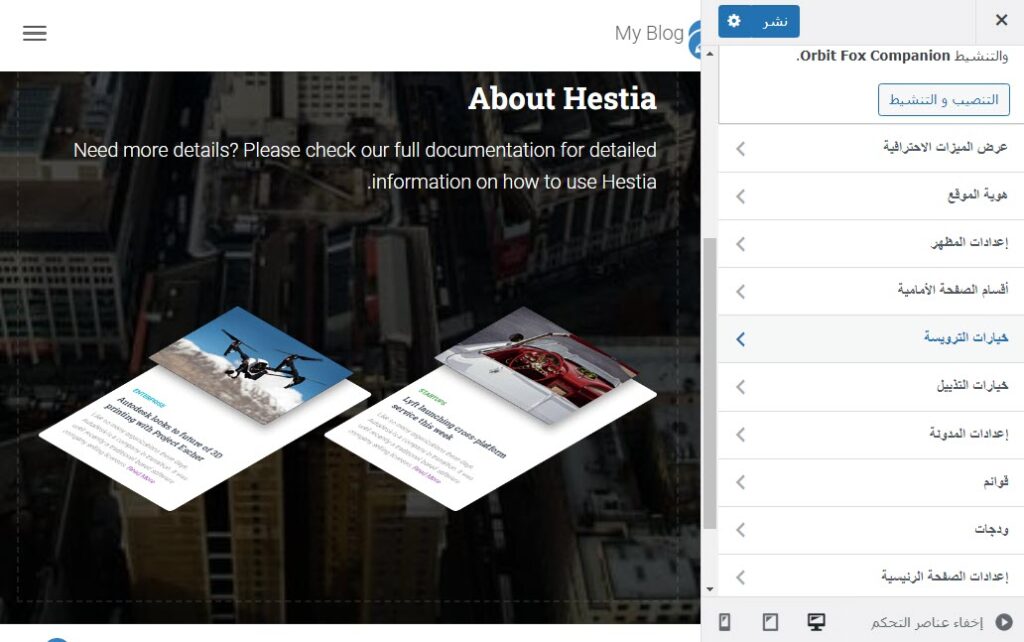 - أولها عبارة عن شريط أدوات موجود في الأعلى يمكِّن المستخدم من تنفيذ عدد من الإجراءات، مثل الرجوع عن آخر التغييرات، وحفظ التغييرات، ومعاينة الصفحة، وأيضًا تعديل إعدادات الموقع الرئيسية، مثل موضع قائمة التنقل، والشعار، والرمز الذي يظهر في شريط المتصفح وغيرها.