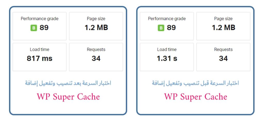 بعد ذلك قمنا بتنصيب إضافة WP Super Cache وقمنا بتفعيلها، ثم أعدنا اختبار سرعة الصفحة نفسها عدة مرات، فلاحظنا اختلافًا كبيرًا في وقت التحميل، إذ حصلنا على أرقام كان أكبرها مساويًا لـ 817 ميلي ثانية، وهذا يعني أننا خفضنا وقت التحميل بنسبة 35%، وهذه نسبة كبيرة وتفيد كثيرًا موقع الووردبريس.