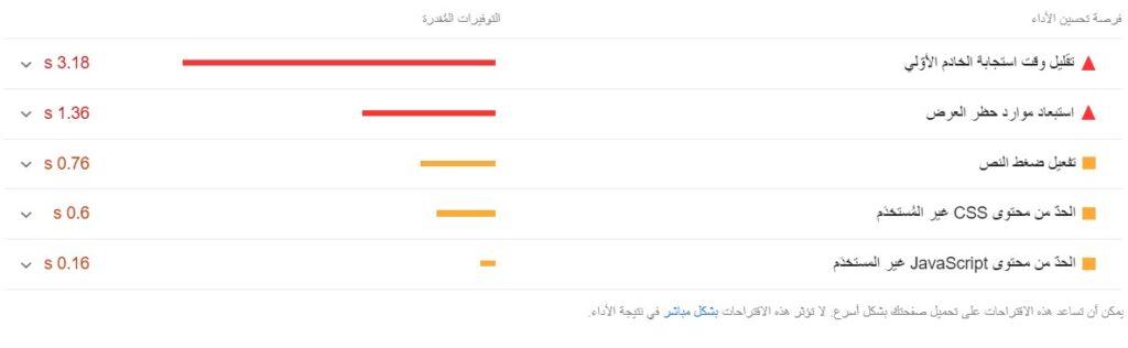 وبعد انتهاء الأداة من تقييم الصفحة وإظهار قيم مقاييس السرعة المختلفة التي ترصدها، فإنها توفر مجموعة من النصائح التي تساعد على تسريعها، كما تذكر قيمة مقدرة لما سيتم توفيره من وقت التحميل في حال تطبيق كل نصيحة، وبعض تلك النصائح في الواقع، يمكن تطبيقه مباشرة ودون جهد أو عناء شديد.