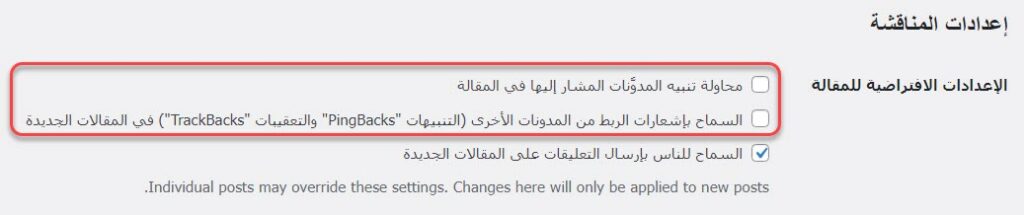 لكن هذه التقنية في الواقع تؤثر على أداء الموقع، ويفضل أن تقوم بتعطيلها من أجل تسريع موقع الووردبريس الخاص بك. من السهل فعل ذلك، إذ عليك فقط أن تتوجه إلى صفحة إعدادات المناقشة عن طريق وضع مؤشر الفأرة على (الإعدادات)، ثم النقر على (المناقشة) في الواجهة الخلفية للووردبريس، ثم أن تقوم بتعطيل أول خيارين وتحفظ التغييرات.