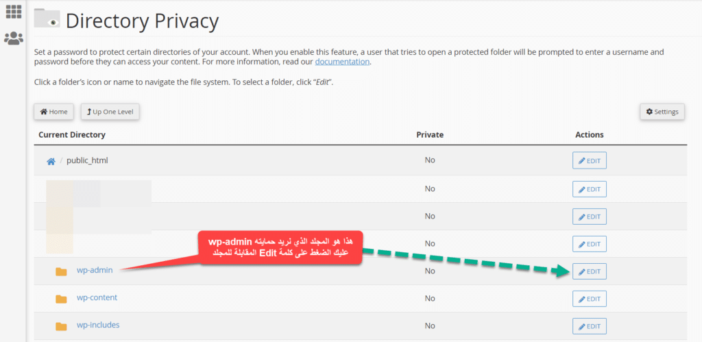- في الصورة أعلاه نريد حماية المجلد wp-admin ولذلك نضغط على كلمة Edit في الجهة المقابلة لنفس المجلد.