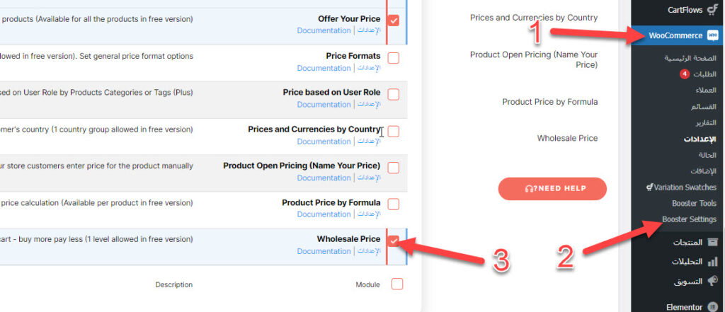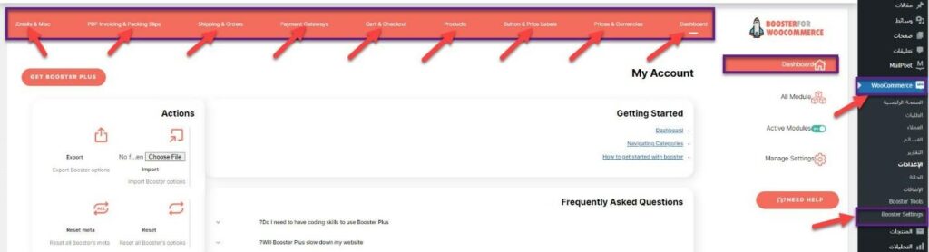 من لوحة تحكم ووردبريس ومن تبويب ووكومرس اضغط على إعدادات بوستر Booster Settings.