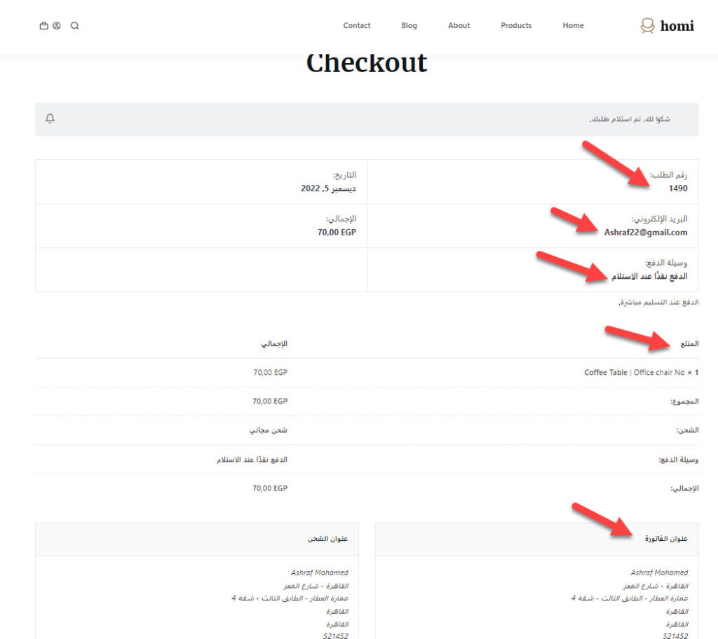 تظهر بعد ذلك فاتورة بها كافة البيانات الخاصة بالمنتج والشحن.