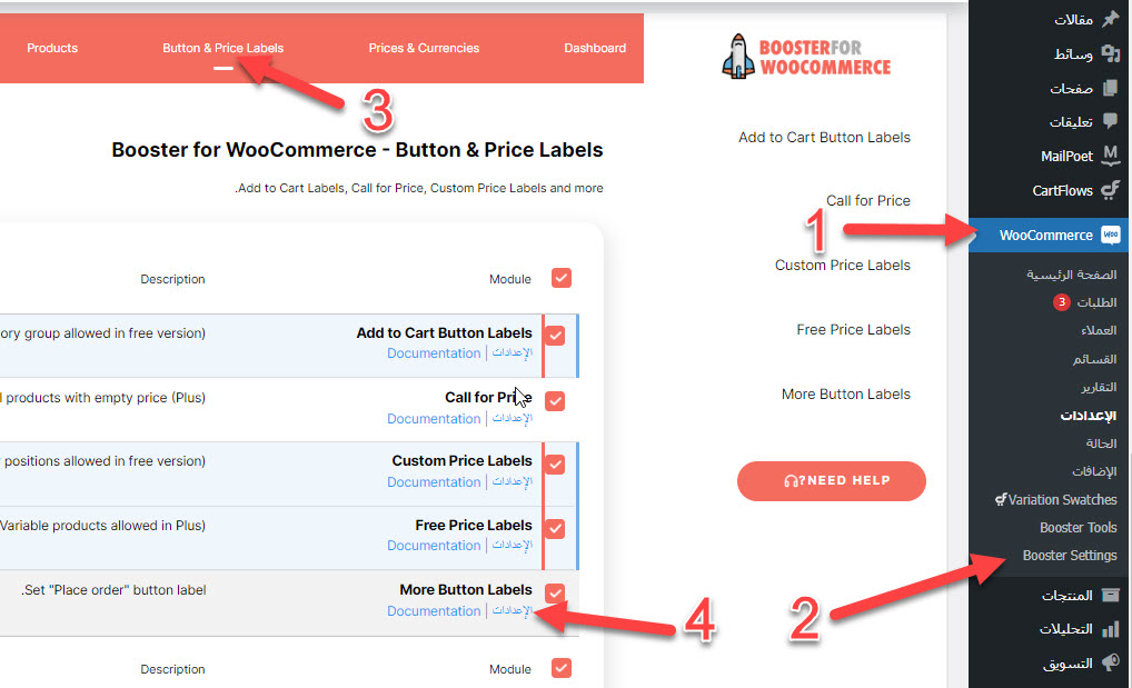 من لوحة تحكم ووكومرس اضغط على Booster Settings ثم اضغط على الأزرار وحقول السعر Button & Price Labels.