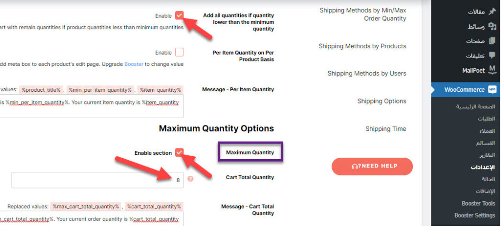 اذهب إلى لوحة تحكم ووكومرس واضغط على Booster Settings ثم اضغط على تبويب Shipping & Orders، ثم فعل الخيار Order Quantities، وبعد ذلك اضغط على حفظ التغييرات.