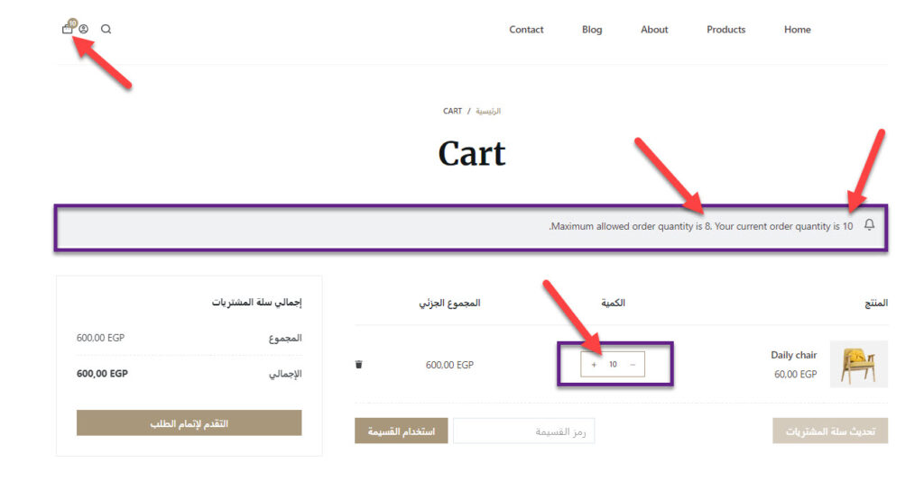 إذا انتقلت إلى المتجر الإلكتروني لمراجعة هذه الخطوات واخترت منتج ما ووضعت في عربة التسوق فعند تجاوز الحد الأقصى في كمية هذا المنتج، سوف تظهر رسالة توضح لك أن الحد الأقصى المسموح به هو (8)، ولن تتمكن من إتمام الطلب إلا بعد تغيير الحد الأقصى.