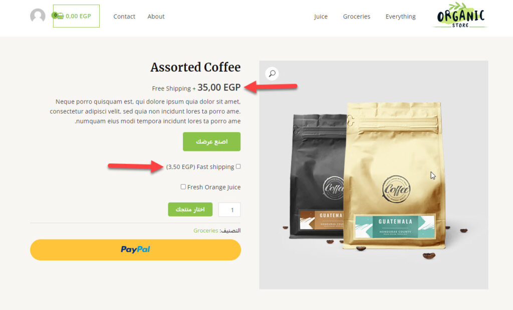 انتقل إلى المتجر واختار أي منتج سوف تجد أنه وضع مبلغ (3.50 EGP) من سعر المنتج وهو (35.00 EGP) كرسوم مقابل الشحن السريع للمنتج.