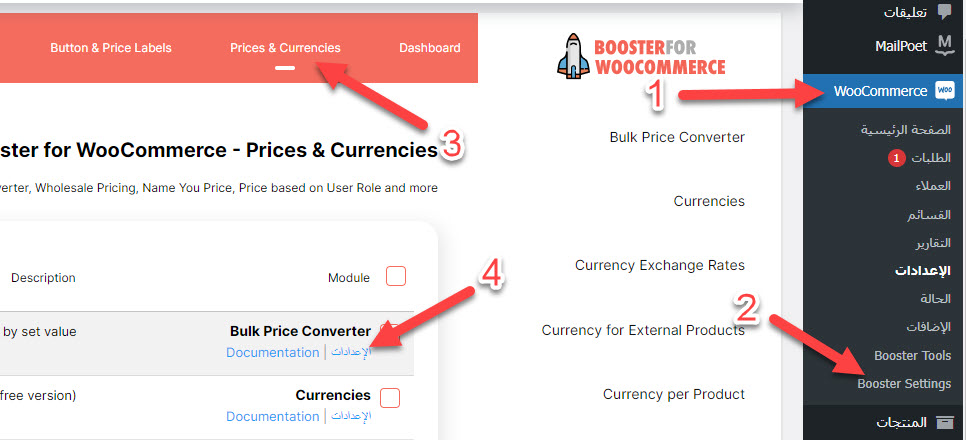 من لوحة تحكم ووكومرس اضغط على Booster Settings، ثم تبويب Prices & Currencies، ثم اضغط على الإعدادات في قائمة Bulk Price Converter.