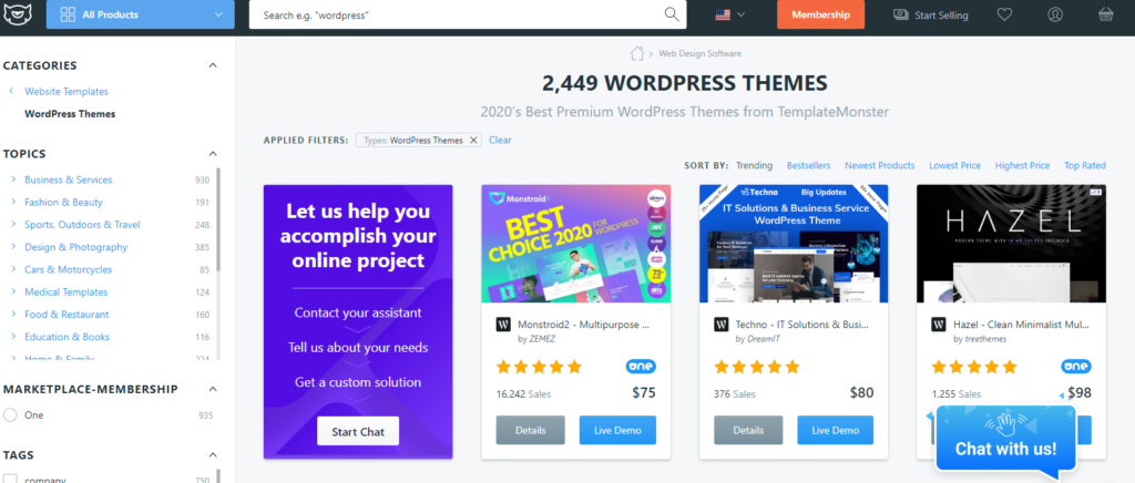 تحتوي TemplateMonster على أكثر من 2100 قالب للوردبريس. ولحسن الحظ، لن يتعين عليك قضاء ساعات في البحث عن القالب الذي يعجبك لأنه توجد عوامل تصفية وخيارات بحث جيدة جداً.