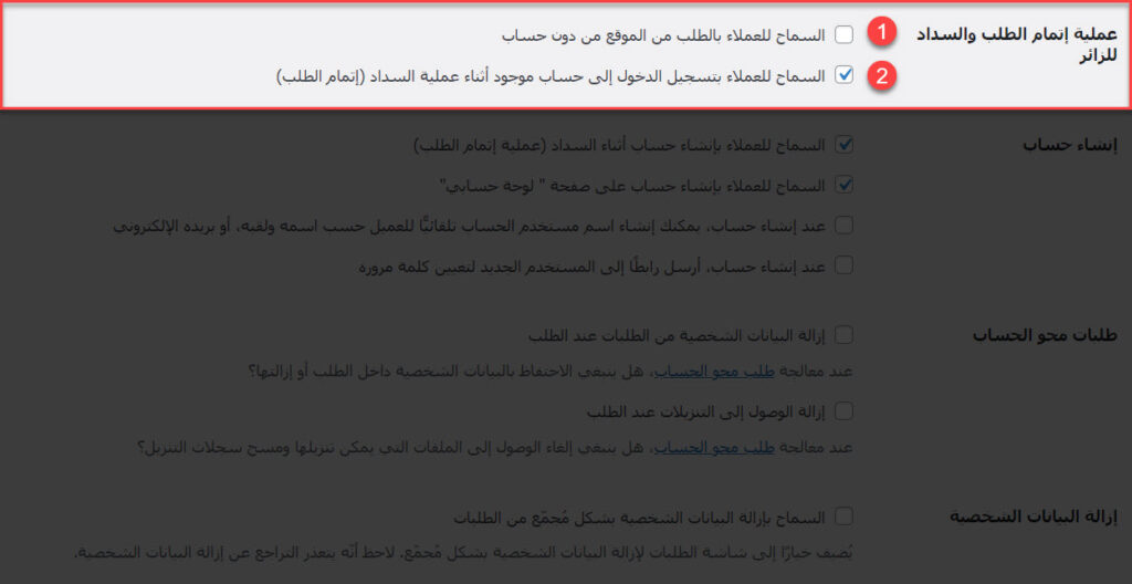 - السماح للعملاء بالطلب من الموقع من دون حساب: تفعيل هذا الخيار يساعد في إمكانية السماح للعملاء لشراء المنتجات من متجرك دون الحاجة إلى التسجيل. ويُنصح عدم تفعيل هذا الخيار للمساعدة في تقليل طلبات الشراء الوهمية.