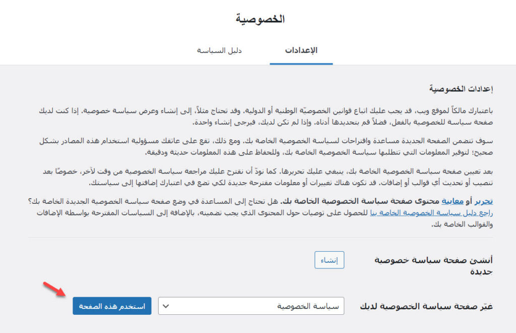 بعد ذلك، تقوم بتعينها كصفحة خصوصية رئيسية عن طريق الضغط على رابط "صحة الخصوصية"، وسيتم توجيهك إلى إعدادات الصوصية. ثم قم بتحديد صفحة الخصوصية على الموقع واضغط على زر "استخدم هذه الصفحة" كما موضح في الصورة التالية: