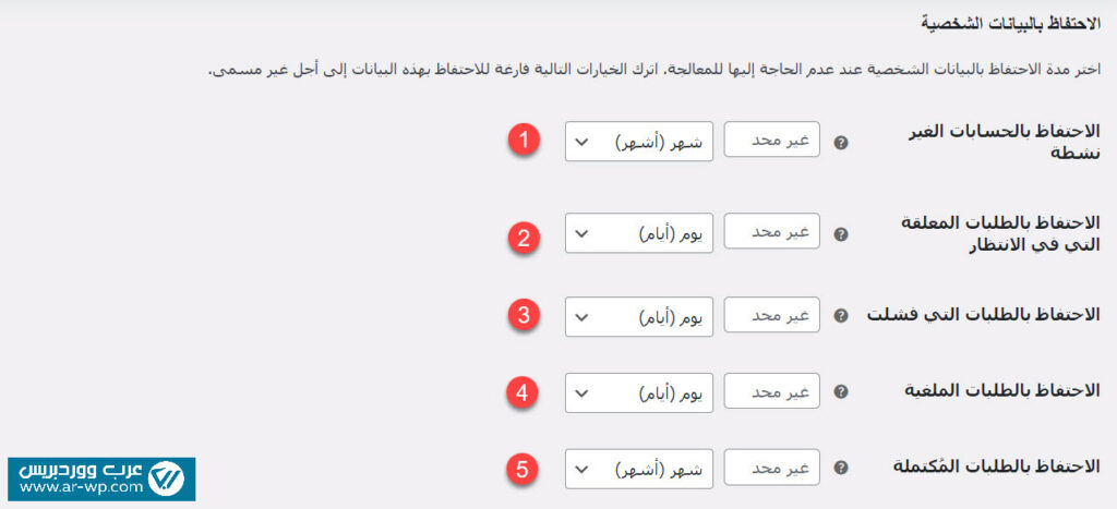 يمكنك من خلال قسم الاحتفاظ بالبيانات الشخصية تحديد المدة بالأيام أو الأسابيع أو الشهور أو السنوات مع تحديد مضاعفات الفترة من خلال الخيارات الآتية: