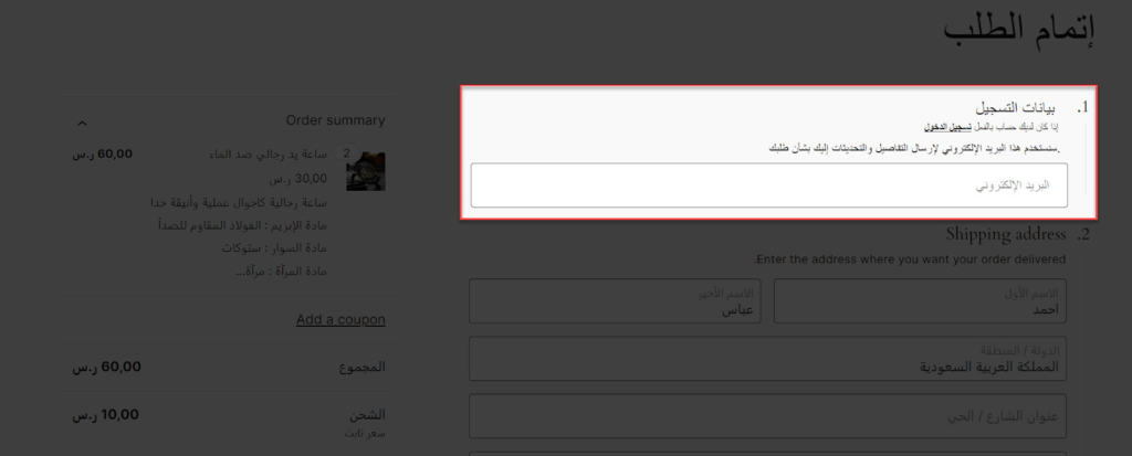 عند تفعيل الخيار الثاني، يظهر قسم تسجيل الدخول في صفحة إتمام الطلب كالآتي: