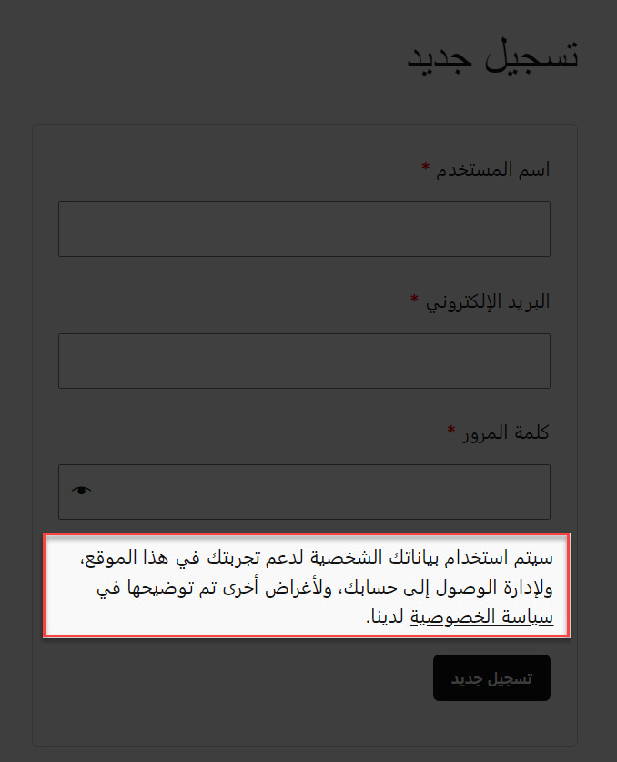 - سياسة الخصوصية المرتبطة بالتسجيل: تقوم بتضمين مقتطف من سياسة الخصوصية المرتبطة بعملية التسجيل في متجرك والتعامل مع البيانات الشخصية، وذلك ليتم عرضه أسفل نموذج التسجيل ليطلع عليه العملاء قبل التسجيل.