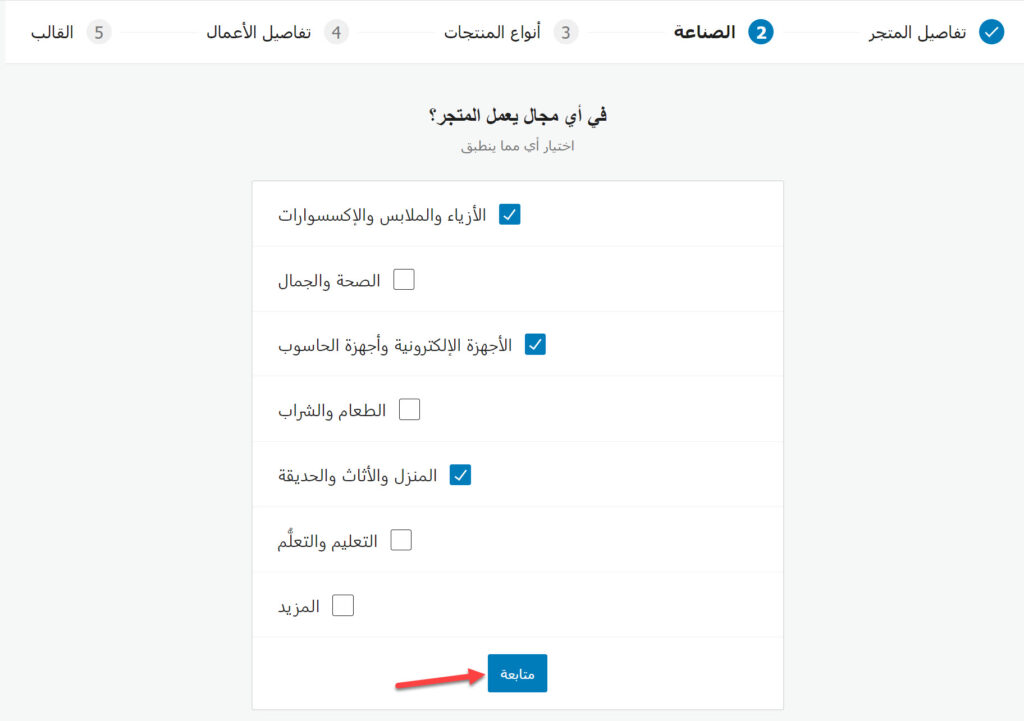 في هذا التبويب عليك أن تقوم باختيار المجالات التي سيعمل بها متجرك. إذا كنت ستبيع منتجات أو خدمات تتبع لأكثر من مجال، فاختر جميع المجالات التي ستعمل بها، ثم انقر على زر (متابعة).