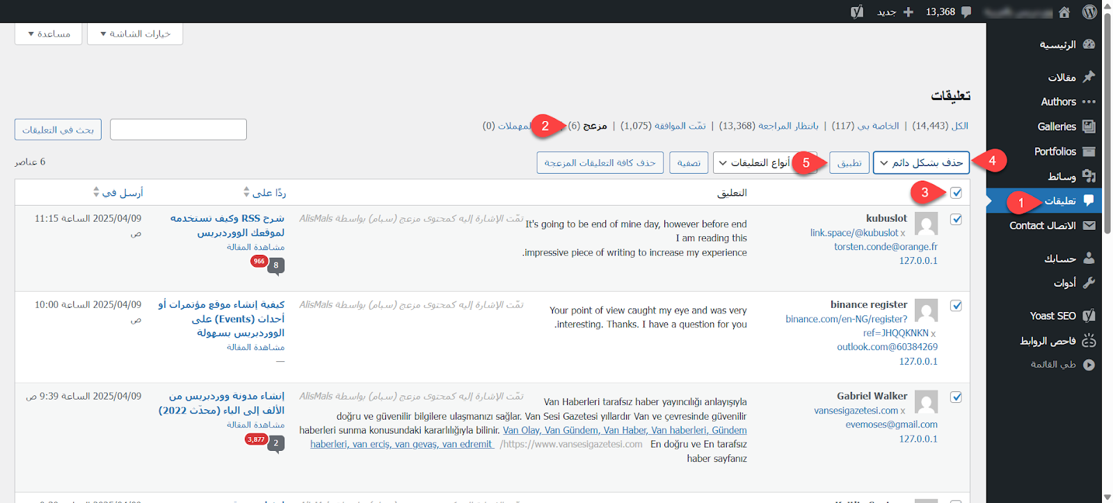 يمكنك إزالة التعليقات المزعجة من موقعك بشكل يدوي من خلال التوجه إلى قسم (التعليقات) ثم تبويب (مزعج) وتحديد جميع التعليقات ومن ثم تحديد خيار (حذف بشكل دائم) والنقر على (تطبيق).