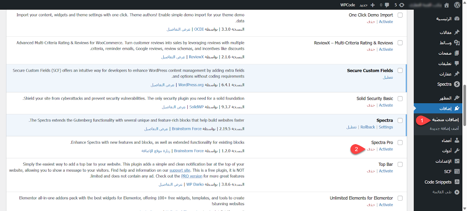 ولذلك يعد حذف الإضافات والقوالب من موقعك أمرًا مهمًا لتحسين تجربة المستخدم والمحافظة على الزور، وتستطيع إزالة أي إضافة مقرصنة من خلال التوجه إلى تبويب (الإضافات المنصبة) ومن ثم النقر على (حذف) الموجود أسفل اسم الإضافة المراد حذفها.