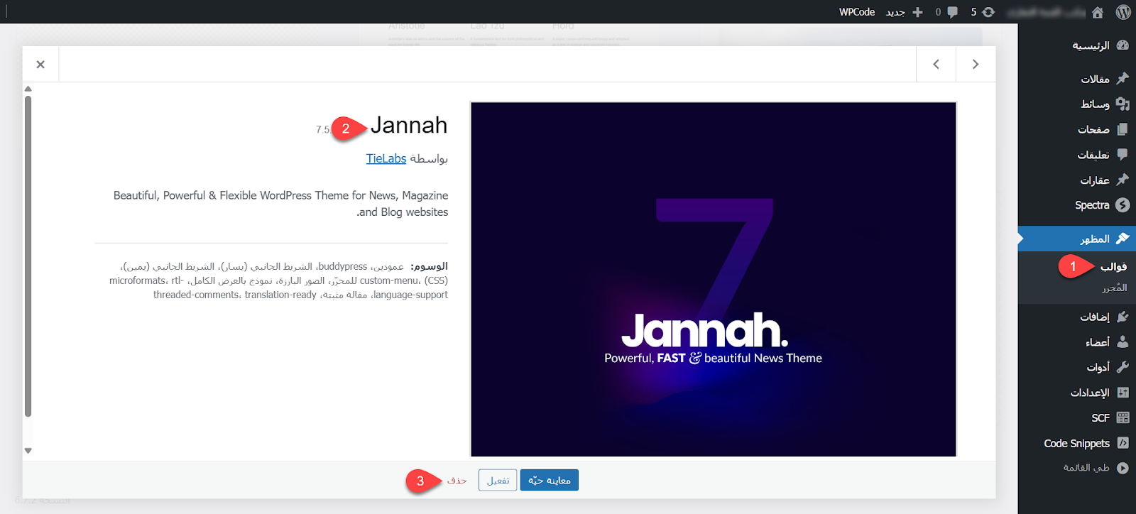 أما بالنسبة لإزالة القوالب المقرصنة، فيمكنك القيام بذلك من خلال التوجه لتبويب (المظهر) ثم (قوالب) ومن ثم الدخول إلى تفاصيل القالب المقرصن وحذفه.