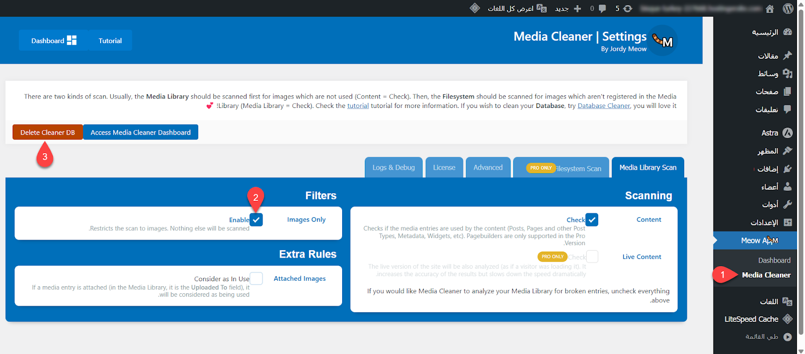 أما إذا كانت المكتبة تحتوي على عديد كبير من الصور فعندها يمكنك استخدام إضافة لإزالة الصور الغير مستخدمة مثل Media Cleaner أو WP-Optimize، فمثلًا لإزالة الصور الغير مستخدمة باستخدام إضافة Media Cleaner ثبت الإضافة ومن ثم توجه إلى تبويب (Media Cleaner) وفعل خيار (Images Only) وانقر على (Delete Cleaner DB).