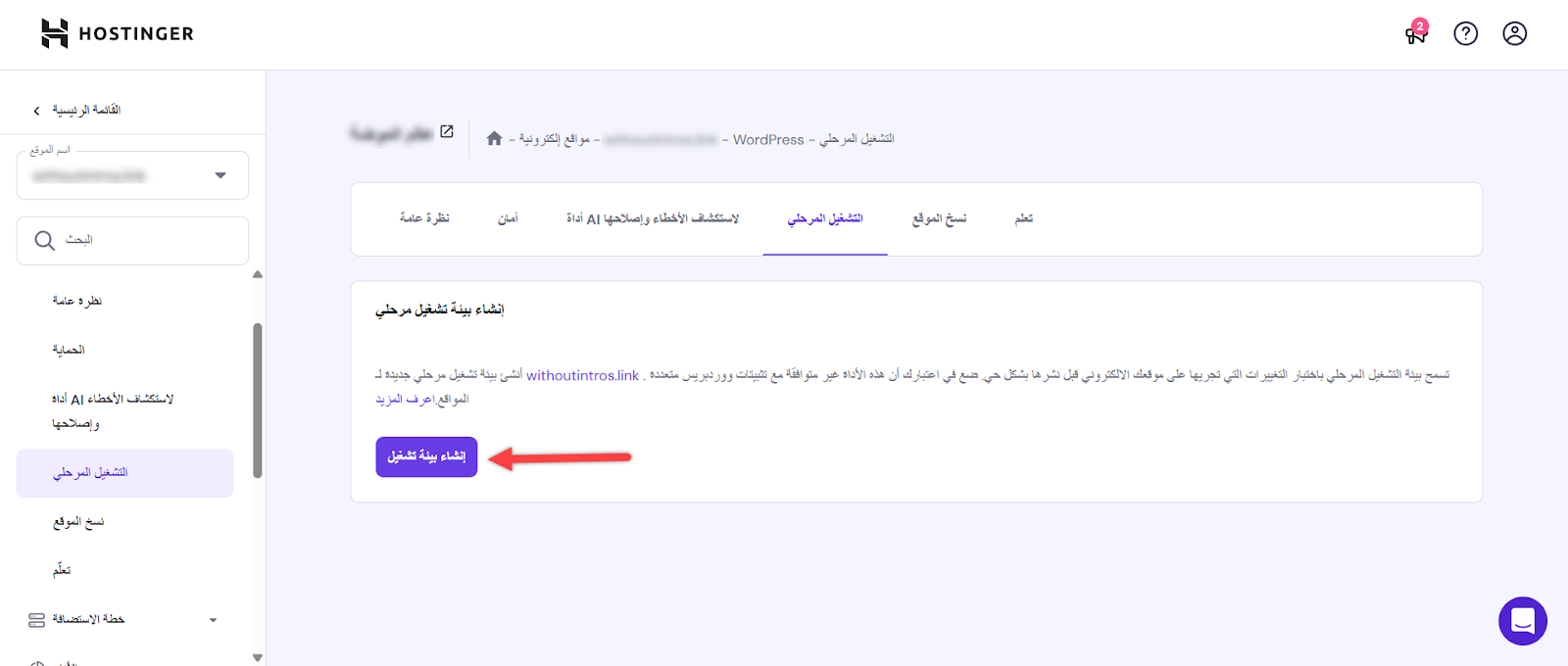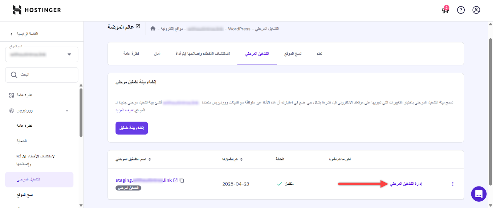 بعد تثبيت الإضافة توجهت إلى قائمتها في لوحة التحكم الرئيسية ونقرت على تبويب (Staging Site) ثم على زر (Create Staging Site) من أجل أن أنشئ بيئة تجريبية من موقع عميلي.