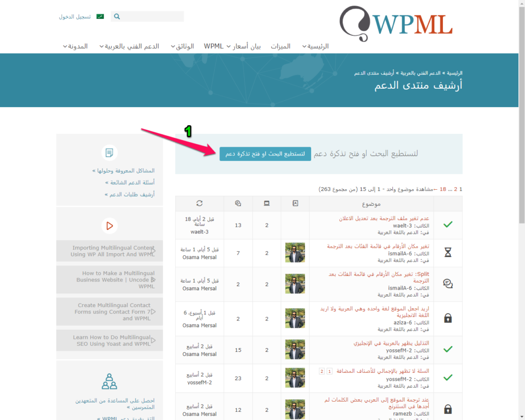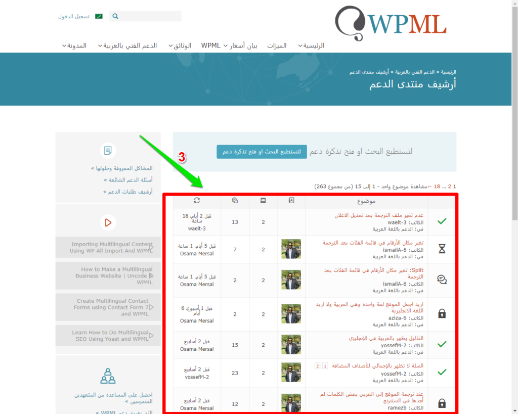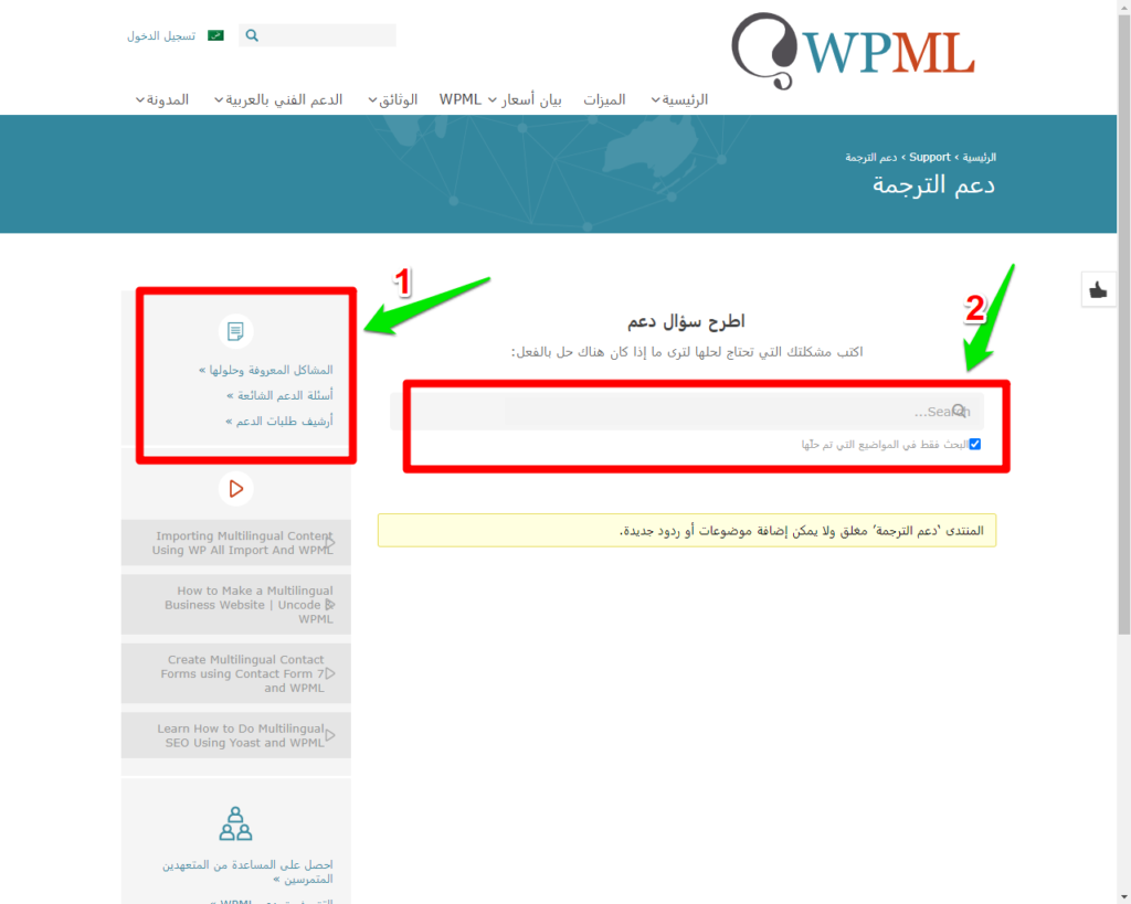 حيث يمكنك بكل بساطة البحث عن المشكلة التي تواجهها في أرشيف منتدى دعم إضافة WPML وأيضًا لا تقلق فالمنتدى يدعم اللغة العربية، وفكرة الأرشيف بكل بساطة أن كل شخص يستخدم إضافة WPML ويتعثر في مشكلة ما ويجد الحل. يتم أرشفة سؤاله أو مشكلته وحلها أيضًا، وبالتالي يحتوي أرشيف منتدى الدعم تقريبًا على أغلب المشكلات التي ستواجهك في موقعك فيما يخص إضافة WPML.