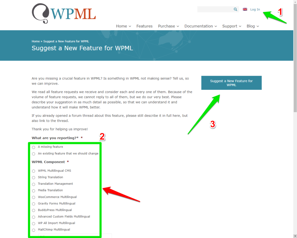 حيث يمكنك اقتراح خصائص معينة تريد أن تُضاف لإضافة WPML وستجد أحد المطورين يناقشك في تلك الفكرة ولو ثبت أن تلك الفكرة أو الخاصية ستعود بالنفع على مستخدمين إضافة WPML فسيتم قبول تلك الفكرة وسيتم تنفيذها. ولكن لاحظ أن صفحة المُقترحات لا تعمل إلا باللغة الإنجليزية. كما في الصورة أدناه. ويمكنك عرض أفكارك من خلال صفحة مقترحات إضافة WPML.