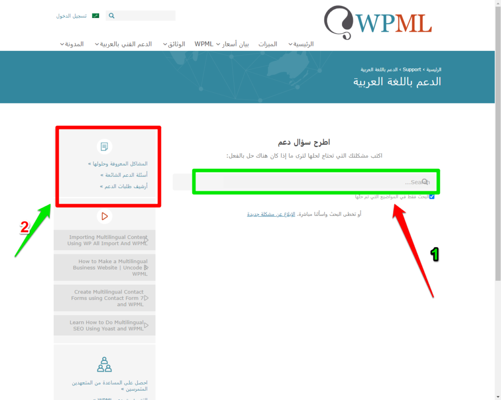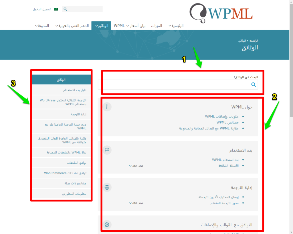 وقسم الوثائق بإضافة WPML أيضًا يُعتبر من الأقسام الرائعة والتي لا تعطيك دعم مباشر مع أحد المطورين. ولكنها توفر لك تجربة رائعة للبحث في قاعدة بيانات العملاء السابقين لإضافة WPML والذين تعثروا من قبل ووجدوا حلول لمشكلاتهم. ويمكن البحث في ثلاثة أماكن كما في الصورة أدناه.
