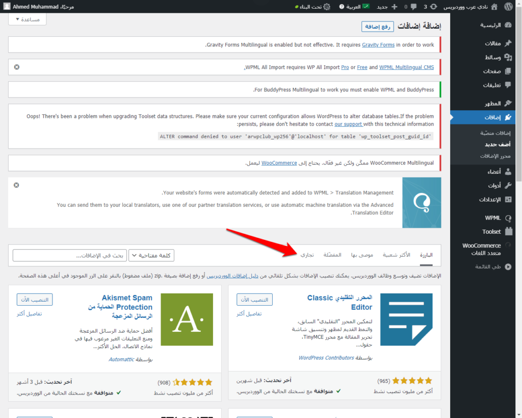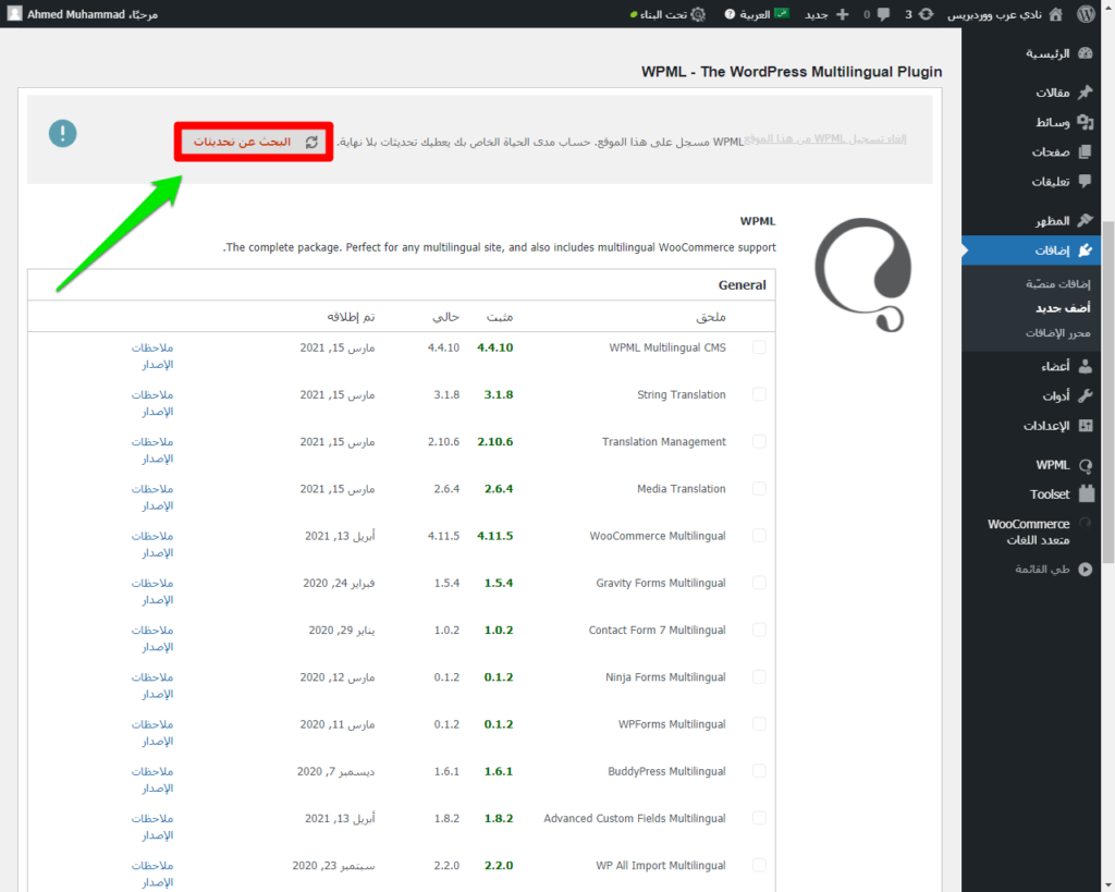 لاحظ أيضًا أن خاصية عرض المعلومات الخاصة بمشكلات بموقعك متوفرة فقط في إصدار WPML 3.1.7 فما أعلى. لذلك إذا كنت تستخدم إصدار أقدم من WPML توجب عليك التحديث، وهذا أمر يسير جدًا، فقط اذهب لمدير الووردبريس بموقعك ومن ثم اذهب لقسم الإضافات ثم قسم إضافة جديد كما في الصورة أدناه.