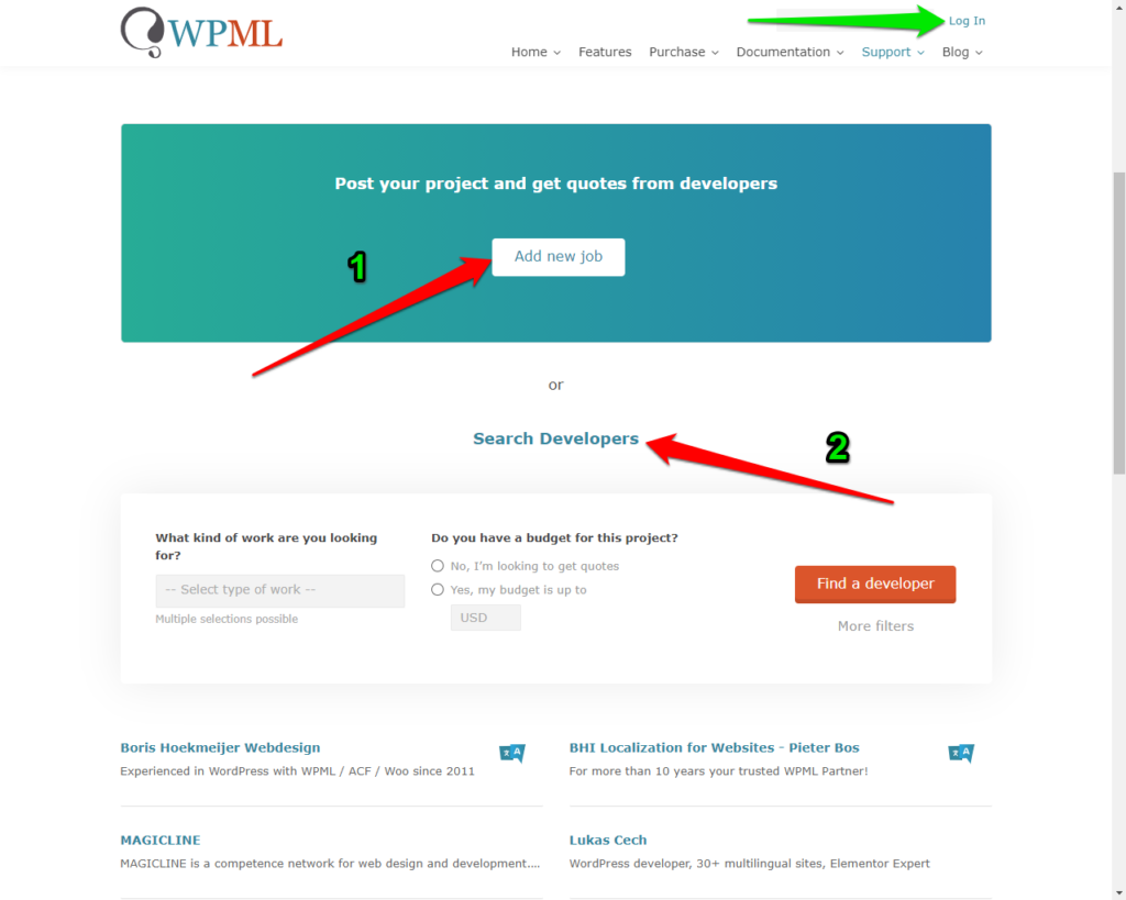 سجل دخولك على موقع WPML، بعدها ادخل على قسم متعهدي WPML المُعتمدين. وبالماوس انزل لأسفل الصفحة، لتجد القسم الخاص بطلب مطورين لحل مشكلتك وهنا لديك خيارين كما في الصورة أدناه.