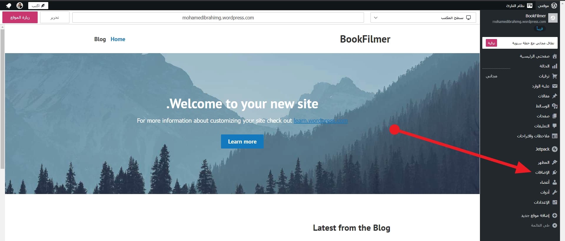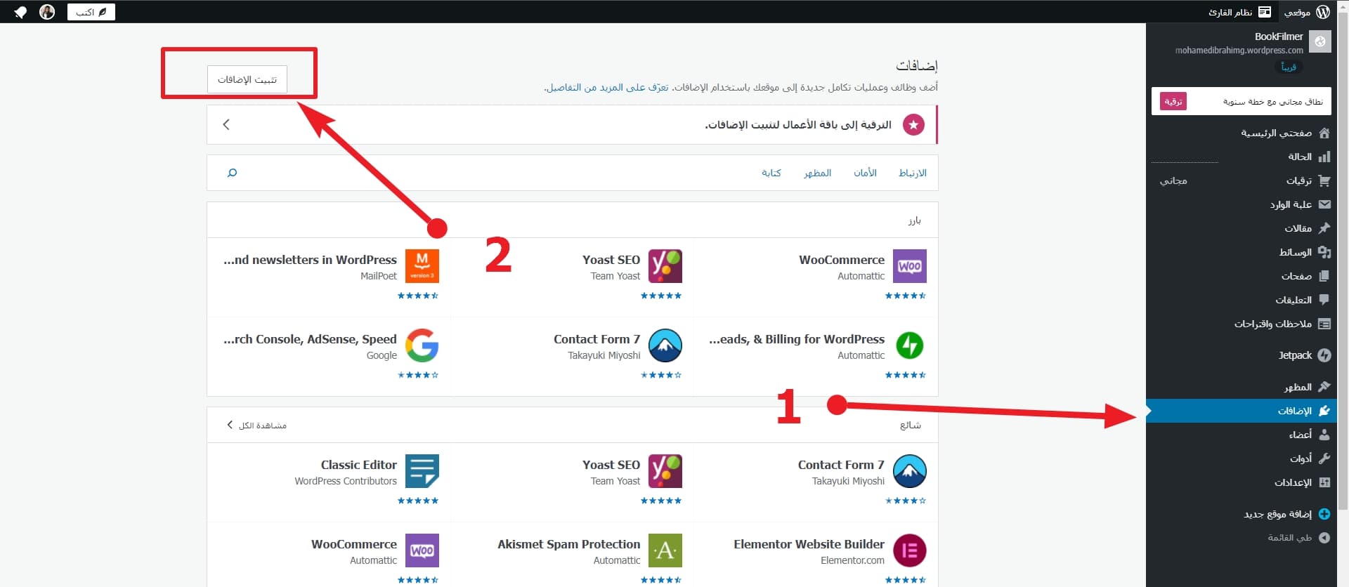 في البداية ستدخل إلى الووردبريس الخاص بك، ثم ستنتقل إلى تبويب الإضافات كما هو موضح في الصورة.