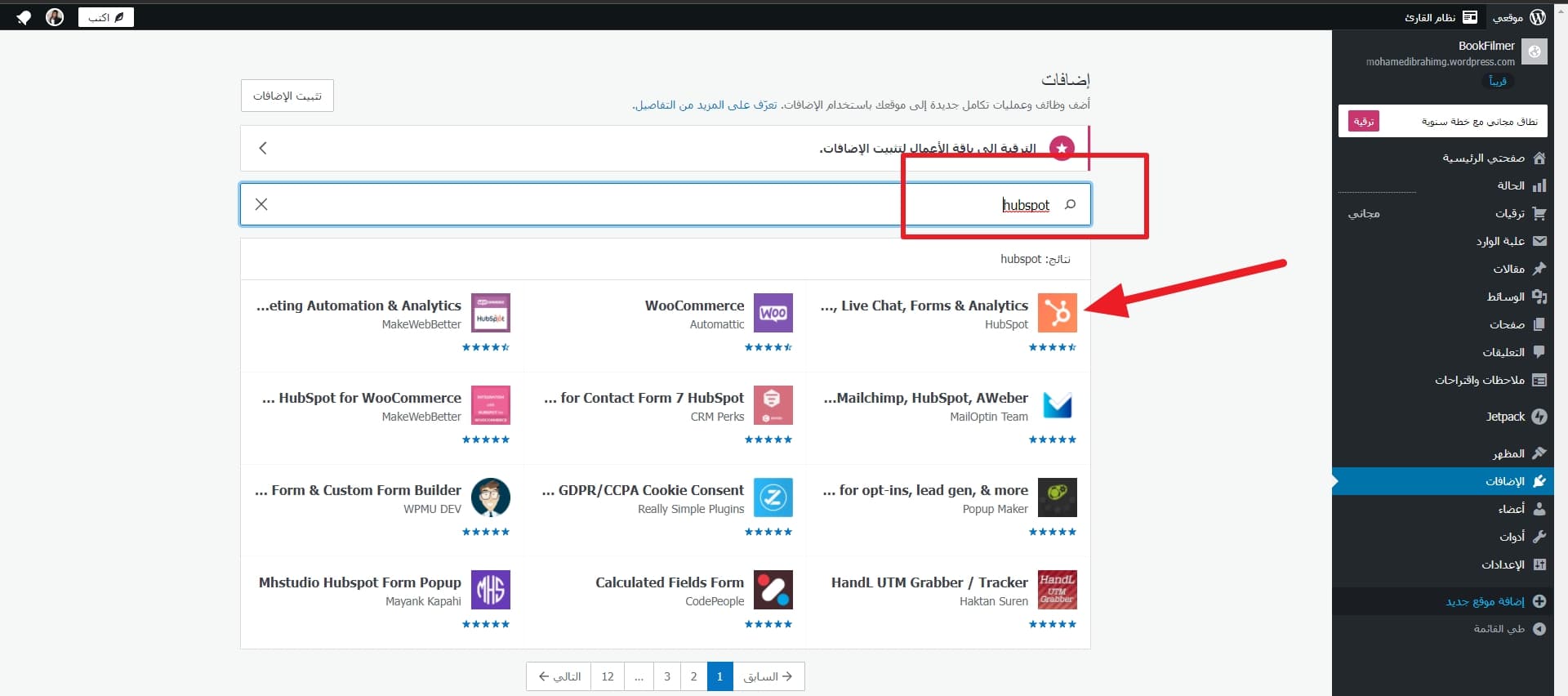 بعد ذلك ستبحث عن الإضافة التي تريدها، في هذه الحالة سنبحث عن "HubSpot".