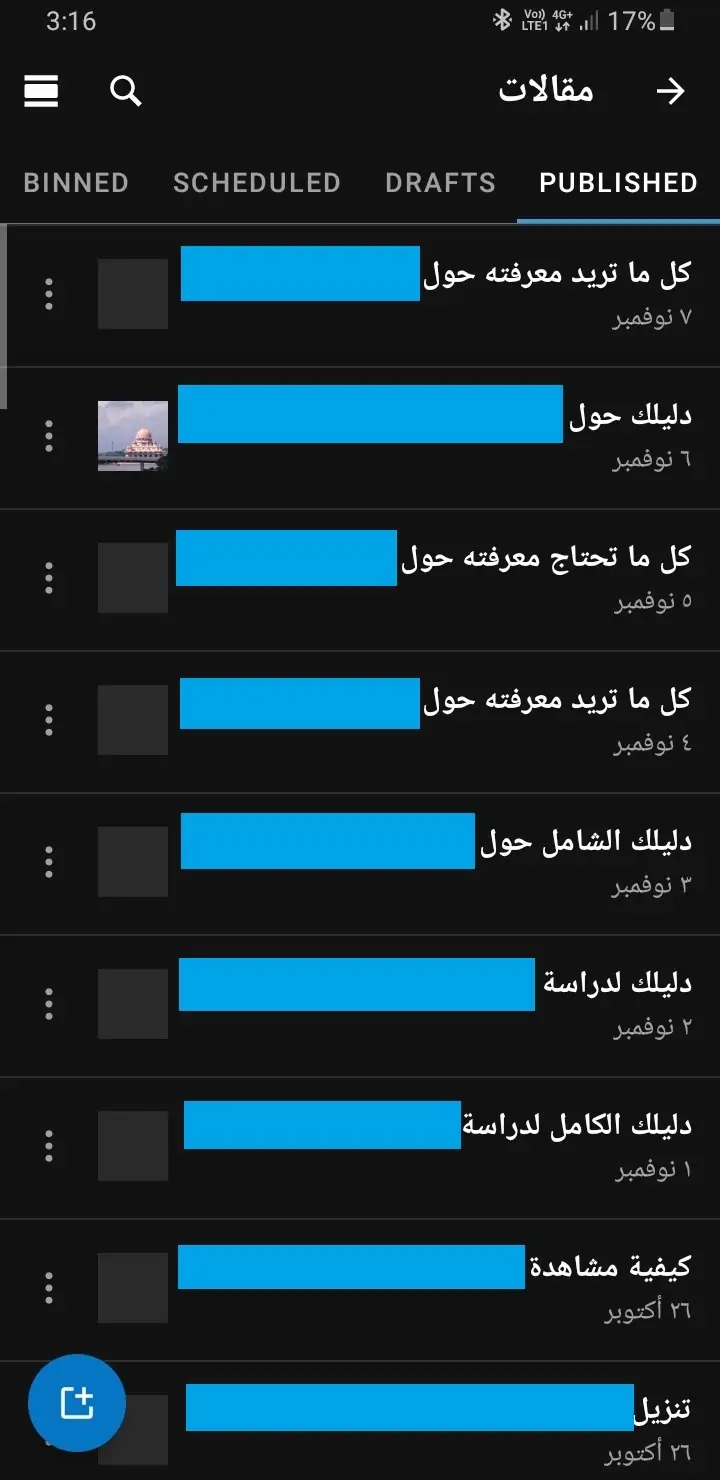 ومن الجانب العلوي للصورة يمكنك ملاحظة وجود تصنيفات المقالات ما إذا كانت منشورة، أو مسودات، أو مجدولة، أو غير ذلك. كما أنك قادر على البدء في كتابة المقالات وإعدادها عبر الضغط على زر + بالأسفل، وهنا يمكنك ملاحظة أن محرر ووردبريس يعمل بشكل ممتاز، على عكس المتصفح: