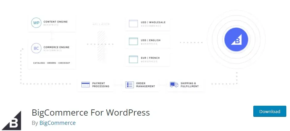 BigCommerce هو نظام أساسي للتجارة الإلكترونية وهو أيضًا من إضافات عربة التسوق. حيث يتيح لك إنشاء عربات تسوق لمتجرك عبر الإنترنت. وهو أيضًا حل مستضاف بالكامل ويتوافق مع نظام ووردبريس بشكل رائع. فيمكنك من خلال هذه الإضافة الجمع بين BigCommerce وووردبريس ولا يلزمك أن تختار أحدهما لموقعك وهي تعتبر خيارًا جيدًا للمتاجر متوسطة الحجم.