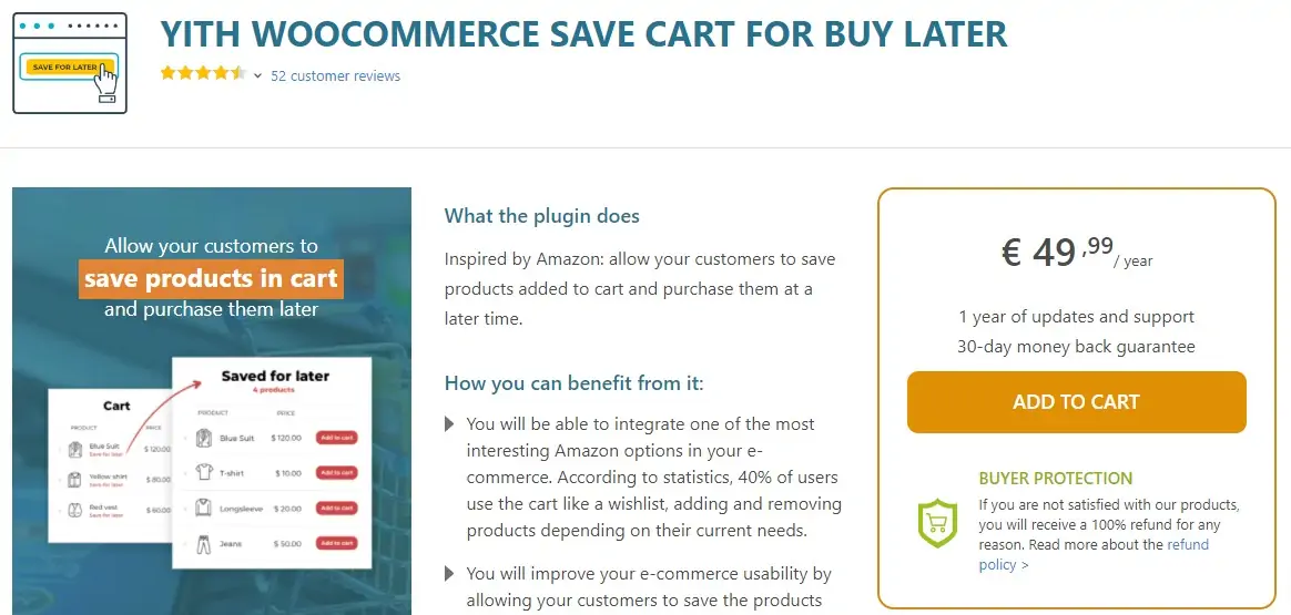 توفر هذه الإضافة YITH WooCommerce Save Cart For Buy Later مفهوم حفظ المنتجات في عربة التسوق المعتمد عند التسوق من أمازون كي تتيح الفرصة للمستخدمين للعودة لها من أجل شرائها لاحقًا. وهذه الميزة تعتبر من المميزات الرائعة التي تساهم في زيادة مبيعاتك بشكل كبير.