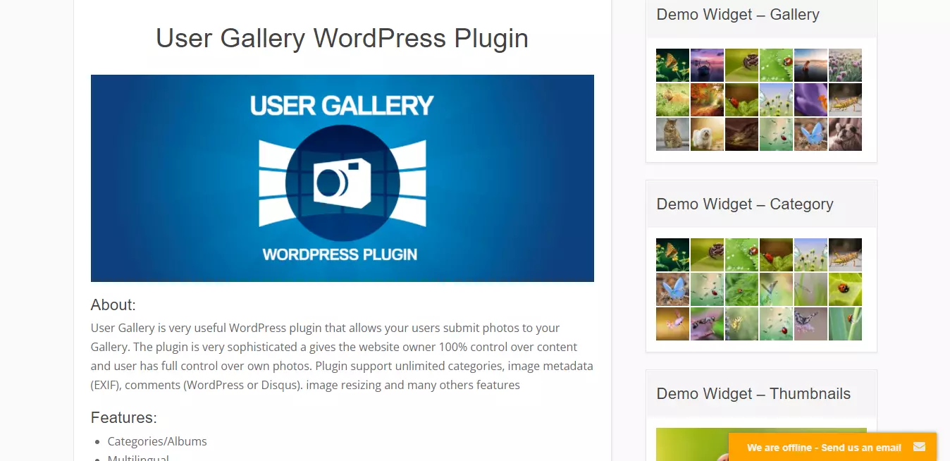 تسمح هذه الإضافة للمستخدمين بإرسال الصور إلى معرض الصور الخاص بك، كما أنها تمنح صاحب الموقع تحكماً كاملاً بنسبة 100% في المحتوى ويتمتع المستخدم بالتحكم الكامل في صوره الخاصة، بالإضافة إلى أنها تدعم فئات غير محدودة وبيانات وصفية للصور EXIF والتعليقات، ومن ميزاتها الأخرى أيضاً ما يلي: