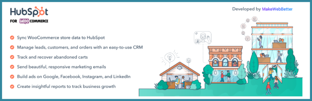 يعد المكون الإضافي HubSpot for WooCommerce أحد إضافات ووكومرس المجانية والقوية في إدارة علاقات العملاء (CRM)، والتسويق عبر البريد الإلكتروني، وتجزئة القوائم، وتقارير تتبع عربة التسوق المهجورة... وغيرها.