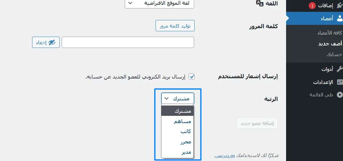 ومن خلال نفس الصفحة يمكنك التحكم في إعدادات مثل لغة الموقع، أو كلمة المرور، أو غيرها من الإعدادات، ونوصي بطبيعة الحال بإدخال عنوان بريد إلكتروني صحيح للمستخدم الجديد. لكن ما يهمنا هي خانة "الرتبة"، وعند الضغط عليها تظهر جميع الخيارات، وهي نفسها ما تحدثنا عنها في الأجزاء السابقة من المقال: