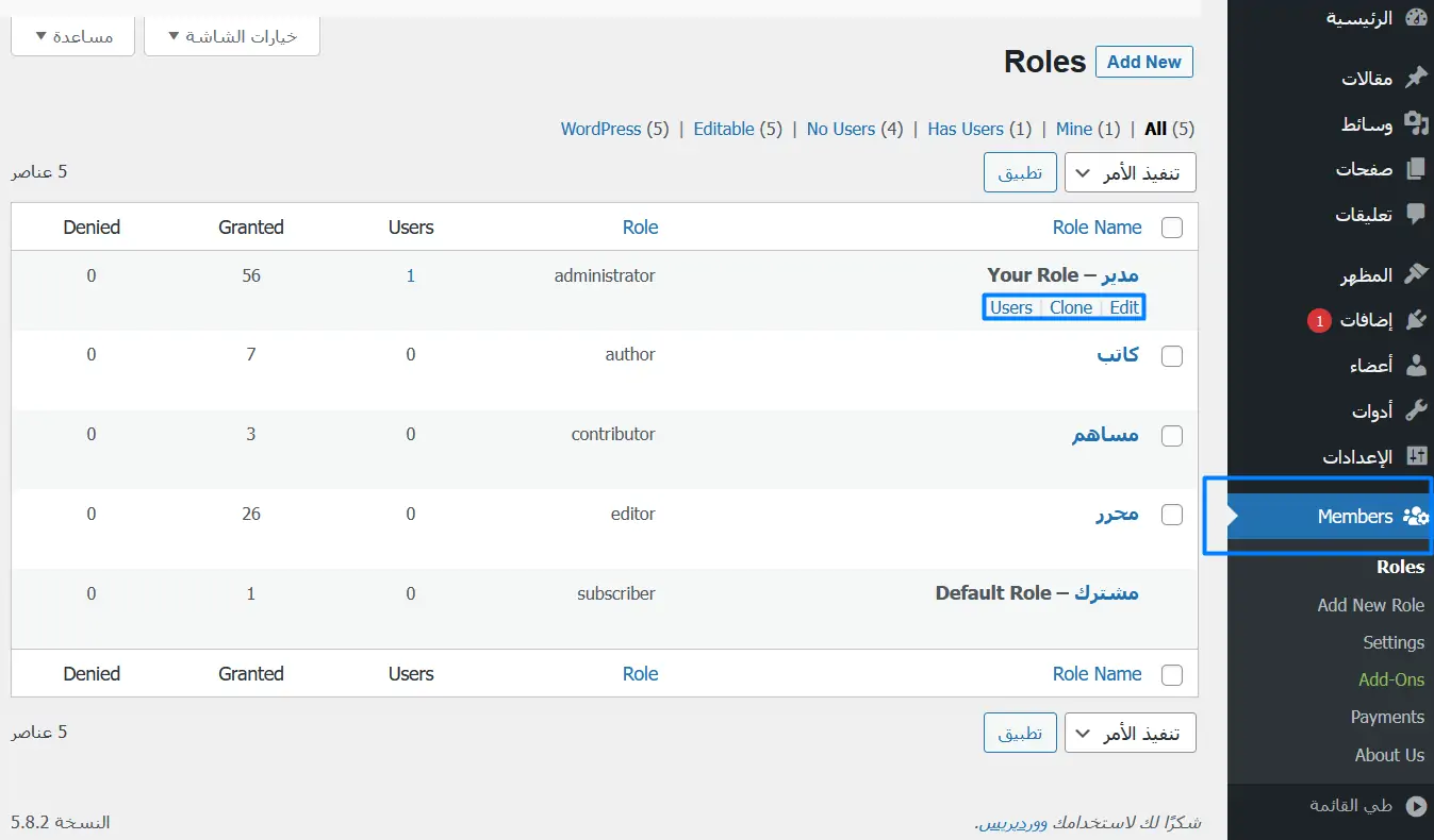 الآن يمكنك أن تلاحظ ظهور خانة Members الخاصة بالإضافة ضمن لوحة التحكم، وبالضغط عليها يظهر لك الرتب الافتراضية الموجودة ضمن ووردبريس، والمميز في الأمر أنك ستكون قادر على تعديلها!